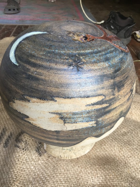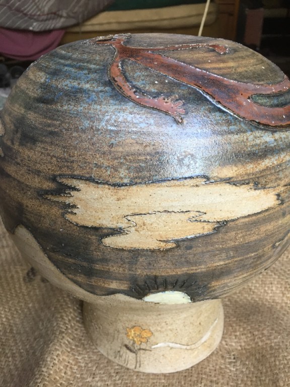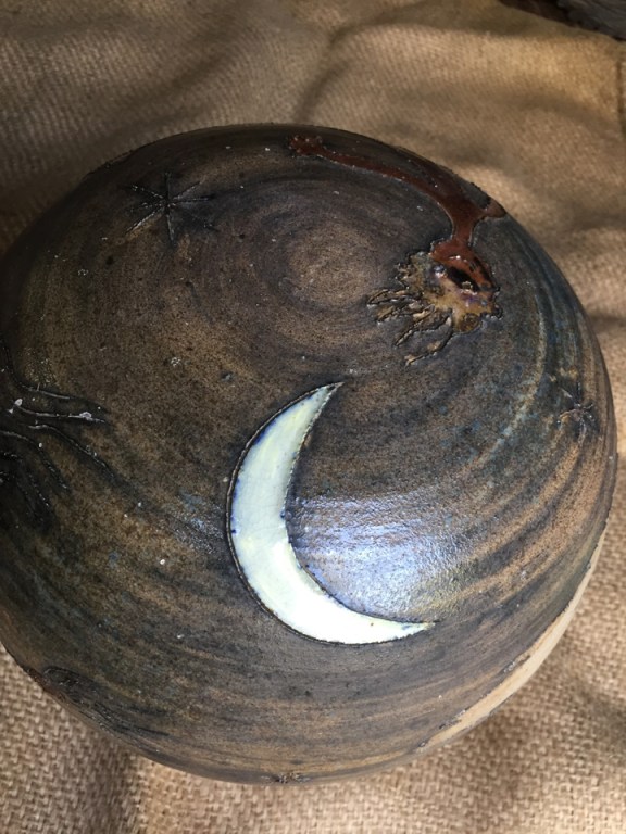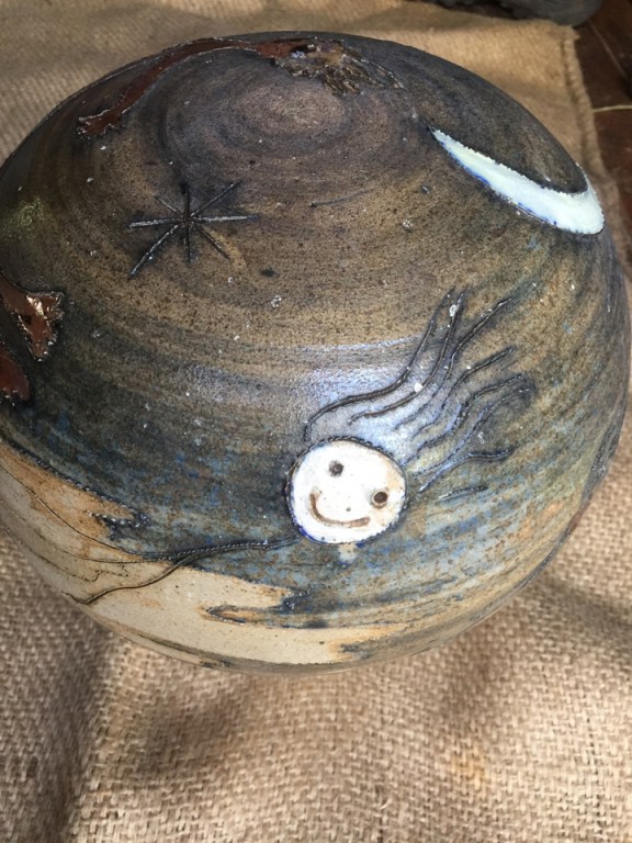 In 1978 after returning to the Northern Rivers Ken did some throwing for Pentagram Pottery in Lismore. While there Gary allowed him to produce a body of work and fired these in his gas stoneware kiln. The surface treatment is multi-faceted sgraffito, wax resist, glaze and brushwork. Upside Down Pots were exhibited at Up Top Gallery in Rockhampton. This piece is still in my personal collection. Up Side Down Pot 1. The motifs depict spirit enteritis floating in the sky with moon and clouds over a fantasy landscape.