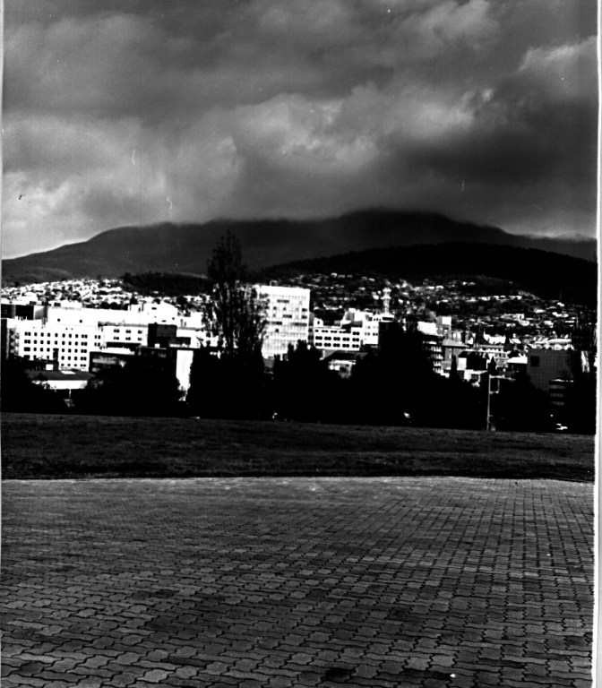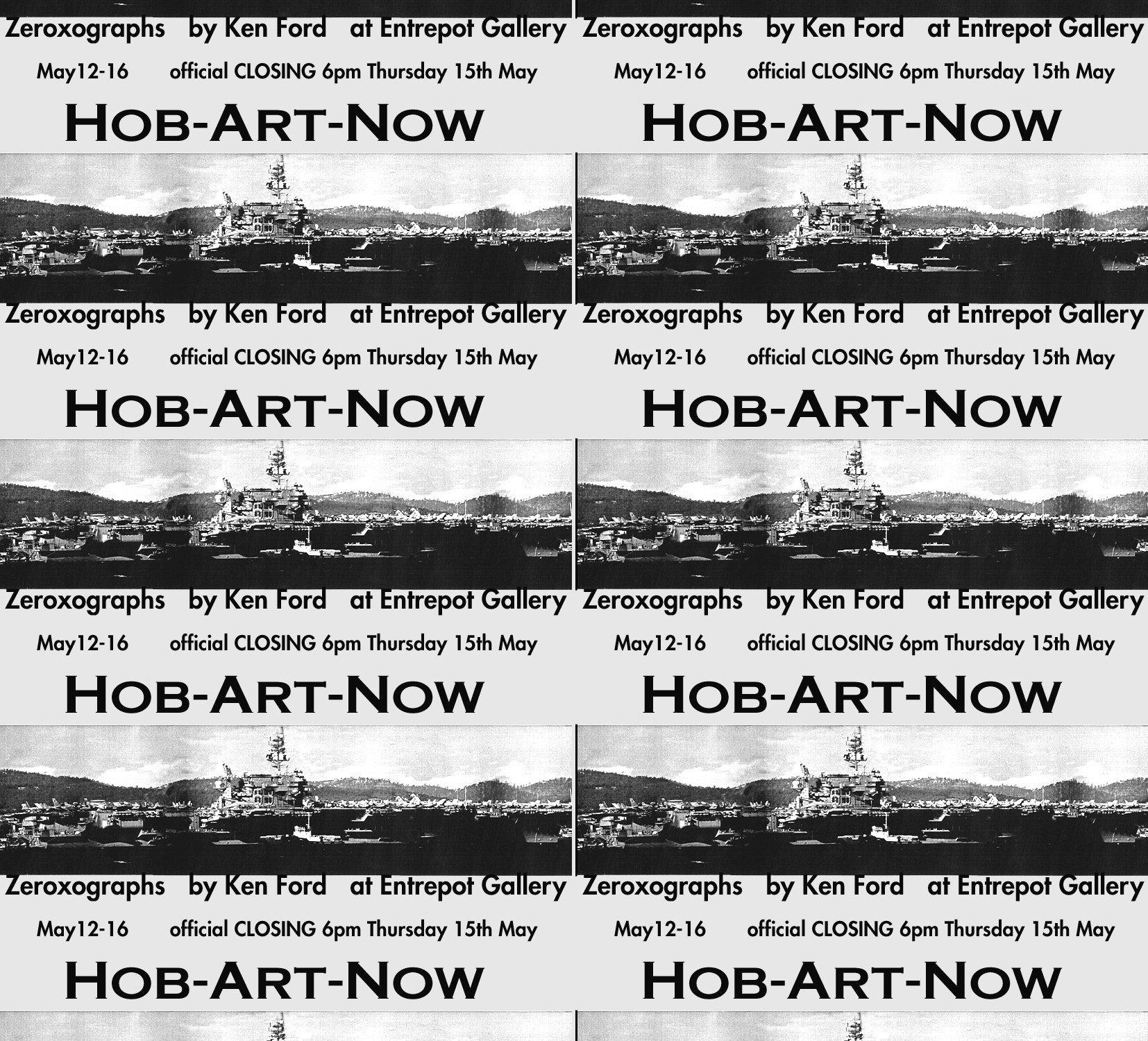 The sense of arrival pervaded the themes of Ken Ford’s early work in Hobart during the early part of 1997. Mt Wellington, the presence of USA naval might, the dock precinct and local artists became motifs for a body of work produced for a show at Entrepôt Gallery in Hunter St. Using a Xerox machine to enlarge a variety of images and turning the gallery into a work space was a novel use of the gallery space. Images printed at A4 or A3 were enlarged, tiled and enlarged again until they became huge joined photocopies. The major work was a panoramic view of Hobart suburbs and surrounds titled “Hob Art Map”. Rather than the usual opening night event there was a closing night event where patrons were invited to mark their place of residence on the photo and draw a line up to the sky and write their name. By the time the show came down there were about 100 names and homes marked. Apart from a few outliers most of the demographic lived in the central suburbs of Hobart.