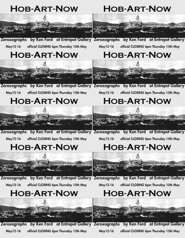 As well as Hob Art Map additional images included a USA aircraft carrier, Kitty Hawk, a montage view of Mt Wellington highlighting the obelistic communication tower, a window view into an artist studio depicting a cornucopia of sculptural elements and a drypoint etching of boats parked at the docks. As a form of printmaking this work was a bit ‘dumbed down’ technically yet innovative low res.