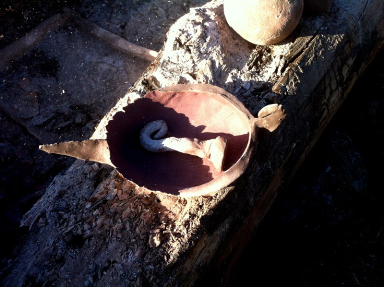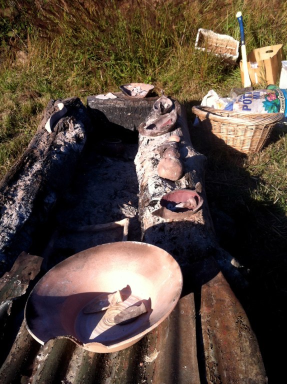 Returning to ceramics after the 2D project Yellow Spectral Sun Living in the Window for the End of Time was winding down, Ken Ford returned to basics with his ceramic processes. Part of this return was the Secret Log Kiln, a rudimentary experimental kiln based on observations during bush fires. 2 logs next to each other creating a channel for flames to flow. With sheets of corrogated iron as a lid temperatures approaching raku were anticipated. The results were encouraging. Alchemy at a basic level.